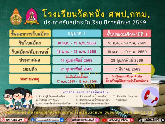 ประกาศโรงเรียนวัดหนัง เรื่อง การรับสมัครนักเรียนเข้าเรียนชั้นอนุบาลปีที่ 1 ชั้นประถมศึกษาปีที่ 1 และชั้นการศึกษาพิเศษปีที่ 1 ภาคเรียนที่ 1 ปีการศึกษา 2568 สังกัดสำนักงานเขตพื้นที่การศึกษาประถมศึกษากรุงเทพมหานคร 17 ก.พ. 68