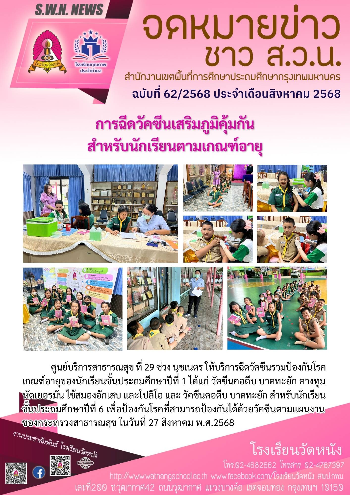 จดหมายข่าว ชาว ส.ว.น. ฉบับที่ 62/2568 การฉีดวัคซีนเสริมภูมิคุ้มกันสำหรับนักเรียนตามเกณฑ์อายุ